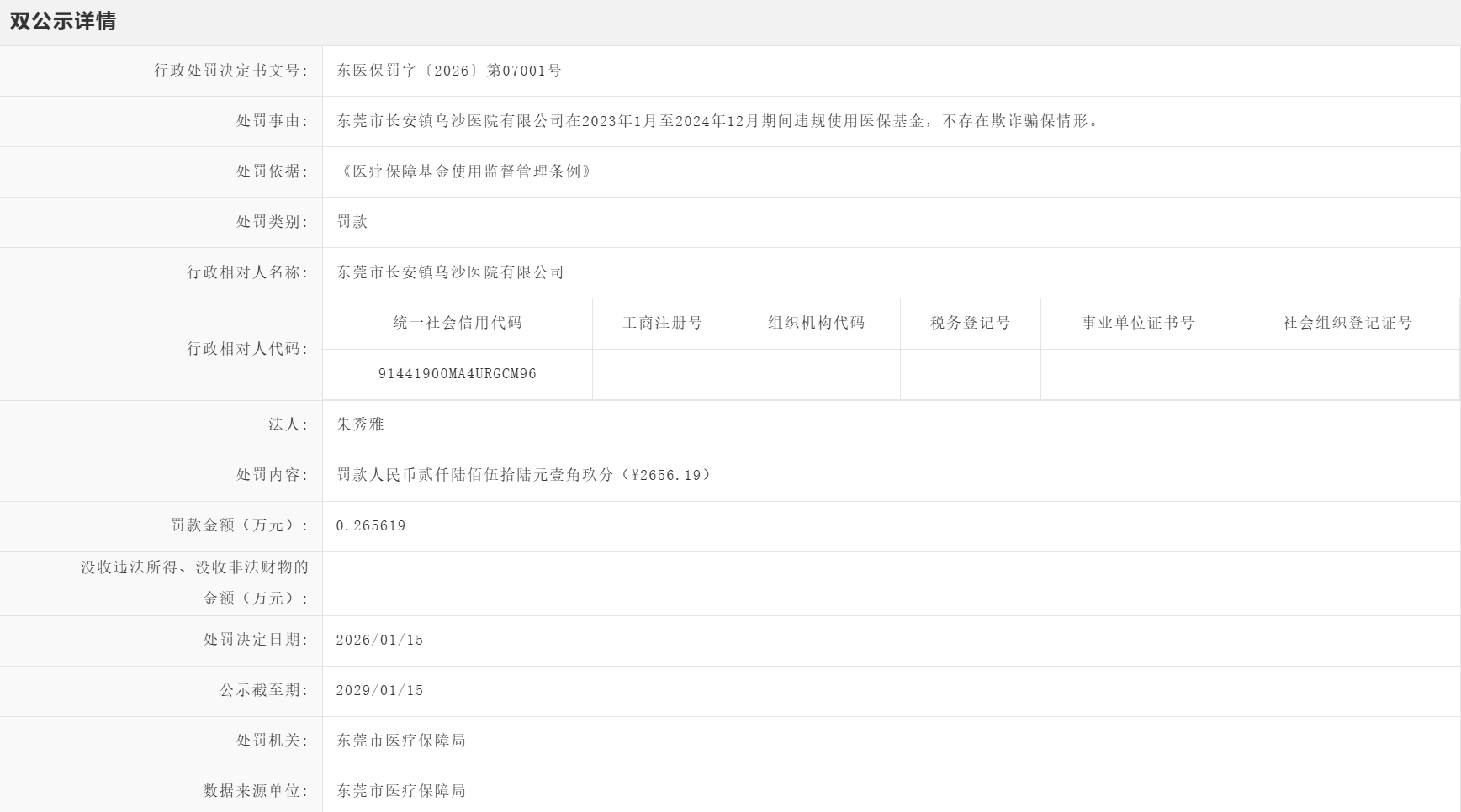 2026-01-24星空体育,星空体育官方网站,星空体育APP下载近日,东莞市医疗保障局对东莞市长安镇乌沙医院有限公司(下称“乌沙医院”)作出行政处罚,因违规使用医保基金对其罚款0.265619万元(2656.19元)。通报明确,此次违规行为不存在欺诈骗保情形,处罚依据为《医疗保障基金使用监督管理条例》。